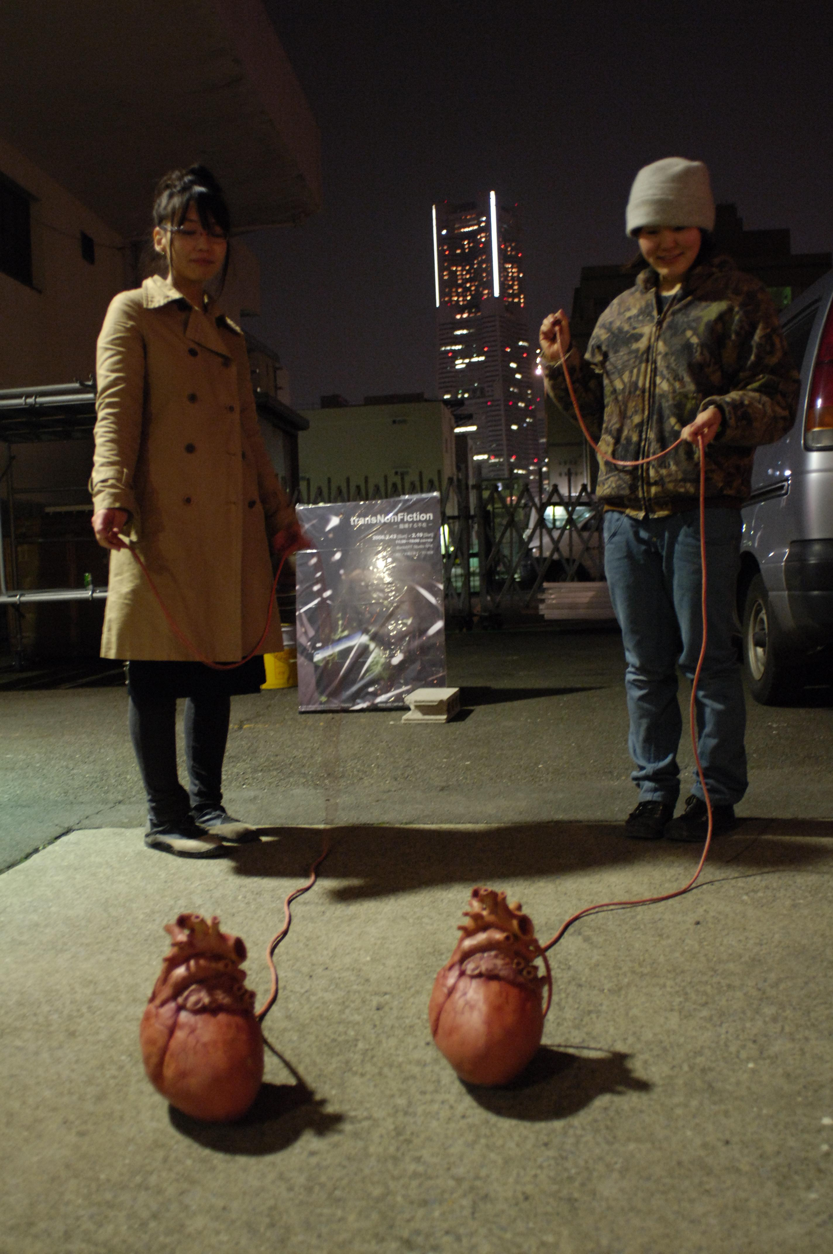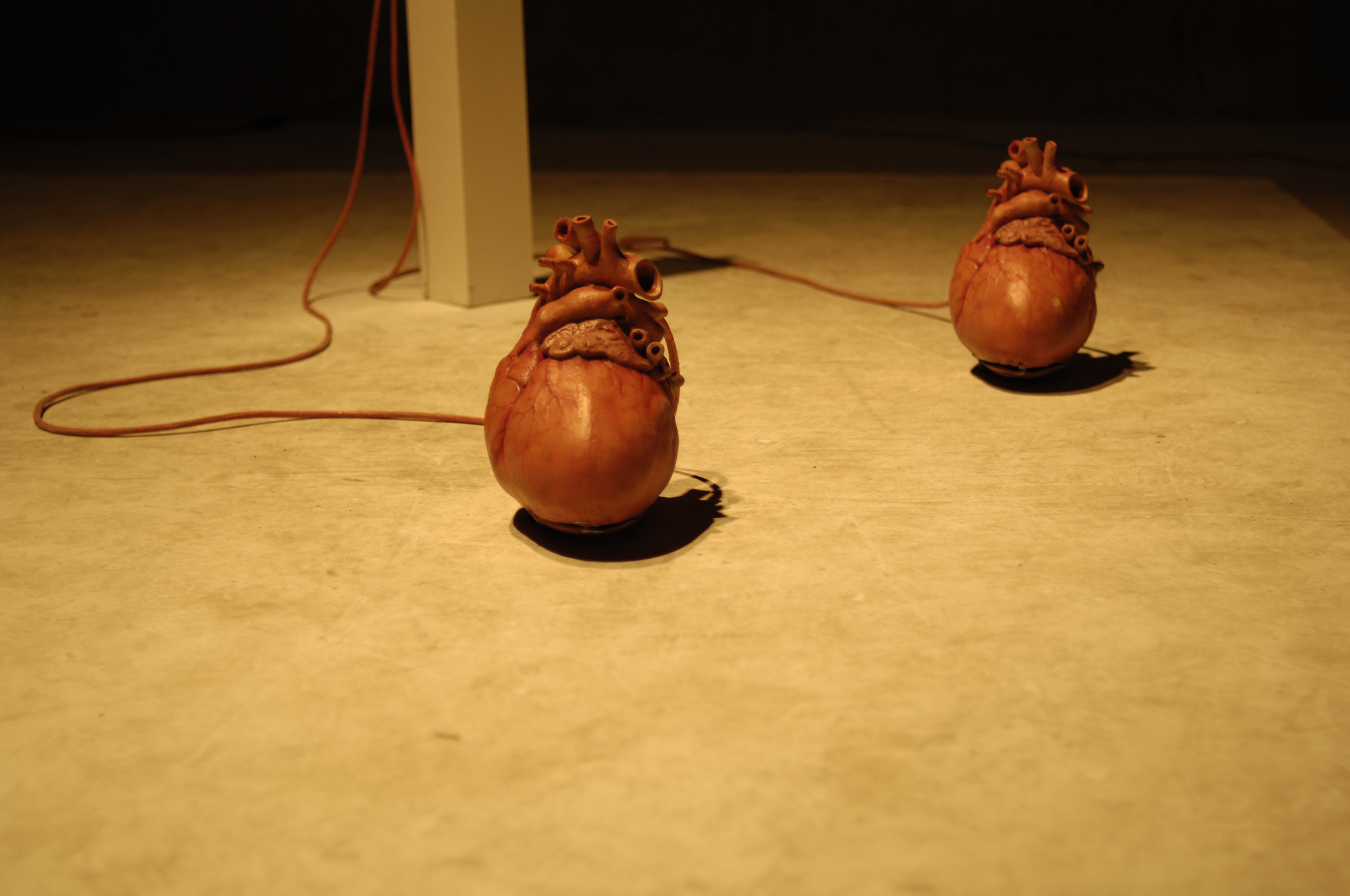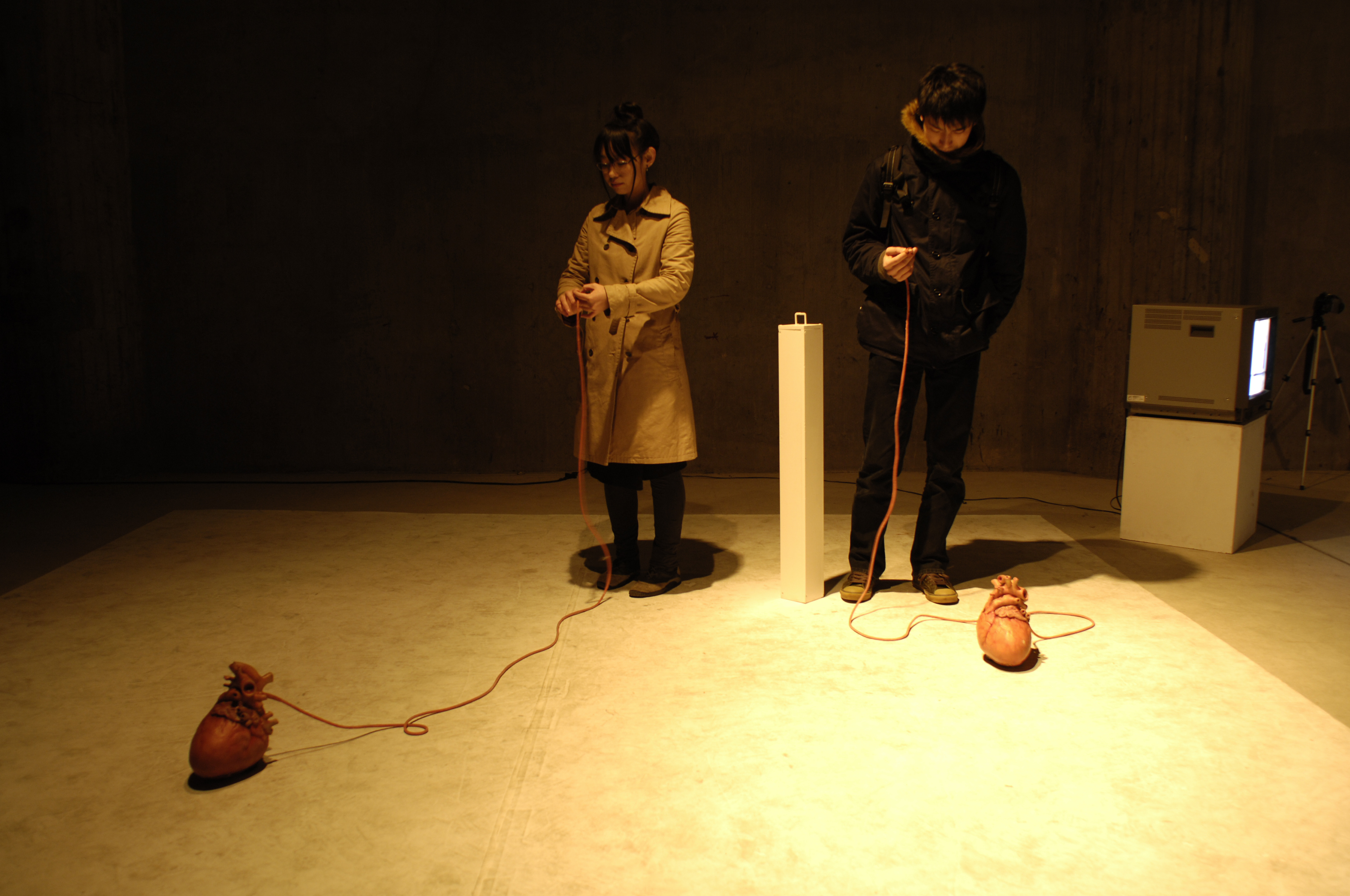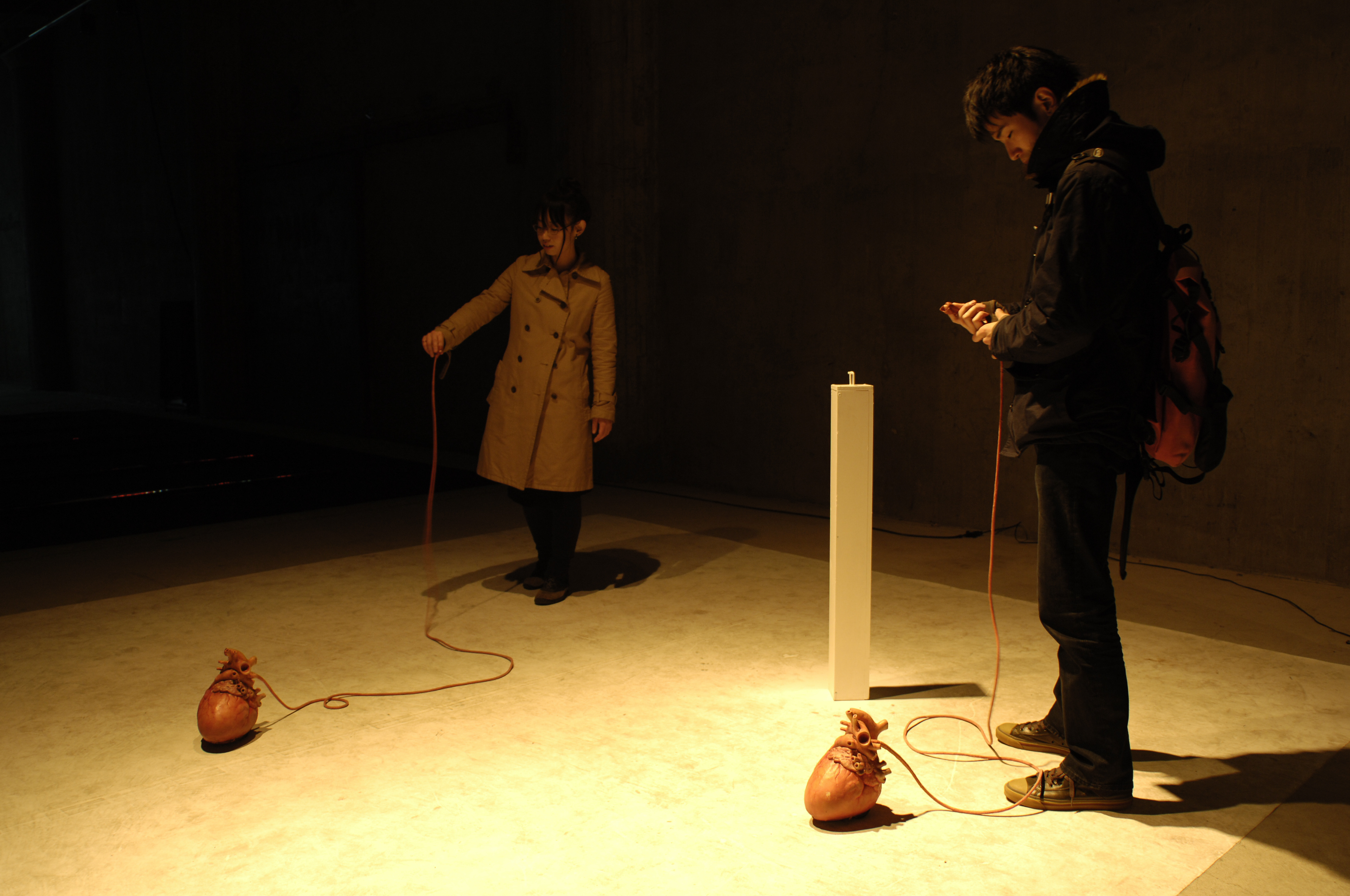 “external_heart” is an interactive art work of which the theme is the "body clock". When the person who experiences applies his or her finger in to the device, the pulse is picked up from the finger.And “external_heart” runs the speed of pulse. The person has an experience pulled to the heart that runs speed of his pulse. The person is invited to the heart that runs speed of the person's pulse.