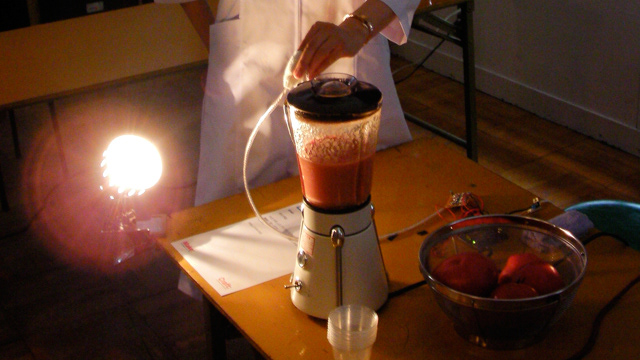 Study that was put out in the trial: "03 Make Tokyo Meeting". Attempt to create a tomato juice in juicer to move as fast as heart rate, and to drink in the audience.